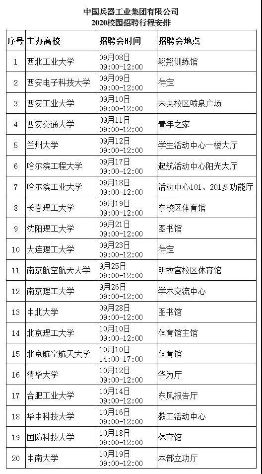 中國兵器工業(yè)集團 2020校園招聘火熱來襲 只等你來哦 有夢想的青年,請往下面看 讓我們攜手強軍報國 公司簡介 我們是我軍機械化、信息化、智能化裝備發(fā)展的骨干 我們是全軍毀傷打擊的核心支撐 我們是現(xiàn)代化新型陸軍體系作戰(zhàn)能力科研制造的主體 我們是國家“一帶一路”建設(shè)和軍民融合發(fā)展的主力 我們就是 中國兵器工業(yè)集團 我們闊步邁進世界一流防務(wù)集團 資產(chǎn)總額3960億元 世界500強企業(yè)排名140 中國制造業(yè)企業(yè)排名第9 連續(xù)15年獲國資委經(jīng)營業(yè)績考核A級 招聘信息 面對2020年離開校園的你們,我們準(zhǔn)備了 >>職位:1500余個 >>招聘人數(shù):3774人 >>專業(yè)涉及: 武器類 武器系統(tǒng)與發(fā)射工程,彈藥工程與爆炸技術(shù),探測制導(dǎo)與控制技術(shù)等 機械類 機械設(shè)計制造及其自動化,車輛工程,工程力學(xué),機械電子工程等 電子類 電氣工程及其自動化,電子信息工程,通信工程,儀器儀表工程等 材料類 金屬材料工程,材料成型及控制工程,高分子材料與工程,材料科學(xué)與工程等 計算機類 計算機科學(xué)與技術(shù),計算機系統(tǒng)結(jié)構(gòu),計算機軟件與理論,網(wǎng)絡(luò)工程等 經(jīng)管類 財務(wù)管理,工商管理,行政管理,人力資源管理,會計學(xué),審計學(xué)等 其他 環(huán)境與安全類,臨床醫(yī)學(xué),語言類,建筑學(xué),法學(xué),采礦工程,化學(xué)類等 行程安排 中國兵器工業(yè)集團2020屆校園招聘會將在全國12個城市、20所高校舉辦,招聘會具體行程見下表: