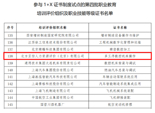 近日,教育部發(fā)布《關(guān)于受權(quán)發(fā)布參與1+X證書制度試點(diǎn)的第四批職業(yè)教育培訓(xùn)評價組織及職業(yè)技能等級證書名單的通知》,中國兵器工業(yè)集團(tuán)北方至信人力資源評價(北京)有限公司獲得“多工序數(shù)控機(jī)床操作”在全國職業(yè)院校的培訓(xùn)、認(rèn)定和發(fā)證權(quán)。