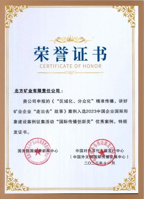 論壇上,“2023中國企業(yè)國際形象建設(shè)案例征集活動(dòng)”評選結(jié)果揭曉。評選活動(dòng)以“挖掘典型案例、建設(shè)企業(yè)形象、講好中國故事”為宗旨,從來自中央企業(yè)、地方國企及民營企業(yè)報(bào)送的251個(gè)有效案例中遴選出“共建新絲路”“跨文化融合”“國際傳播創(chuàng)新”“筑夢人物故事”四類專項(xiàng)優(yōu)秀案例共40個(gè)。中國兵器工業(yè)集團(tuán)北方公司北方礦業(yè)有限責(zé)任公司案例《“區(qū)域化、分眾化”精準(zhǔn)傳播,講好礦業(yè)企業(yè)“走出去”故事》入選“國際傳播創(chuàng)新類”優(yōu)秀案例。